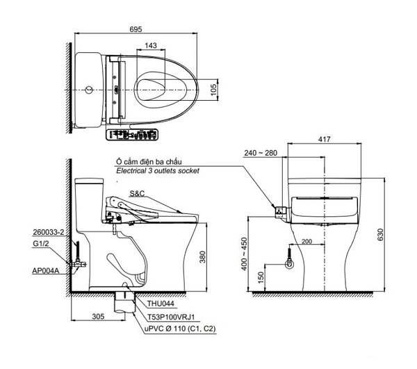 Bản vẽ kích thước bồn cầu TOTO MS855DW16 Washlet dòng S7