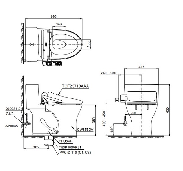 Bản vẽ kỹ thuật bồn cầu Toto MS855DW18#XW