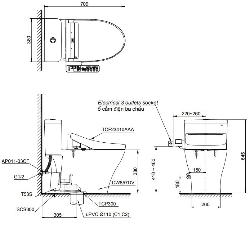 Bản vẽ kích thước bồn cầu TOTO MS857DW16 Washlet dòng S7