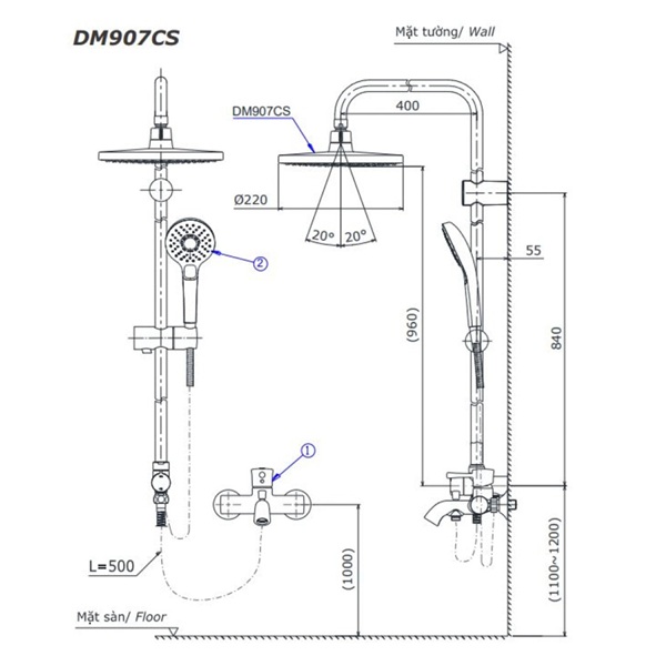 Bản vẽ kích thước sen tắm cây Toto DM907CS