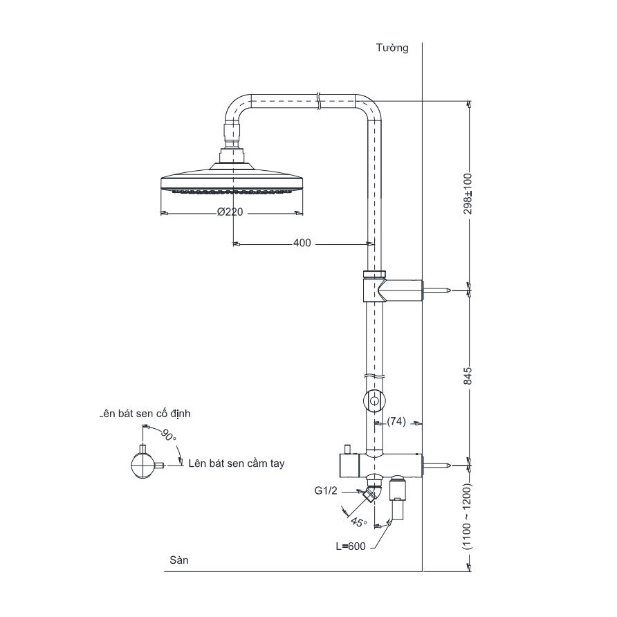 Bản vẽ kích thước sen tắm cây Toto TBW01001BA
