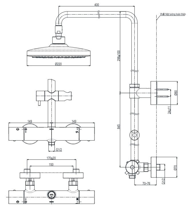 Bản vẽ kích thước sen tắm cây Toto TBW01404AA